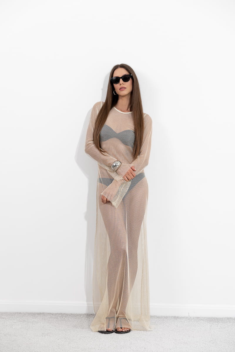 The Kaia Gold Dress is sunlight captured in motion, sheer, fluid, and effortlessly radiant. Its golden mesh shimmers with every move, while the long bell sleeves and side slit add grace and sensual ease. Light as air and glowing with warmth, it embodies the essence of endless summer.