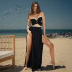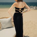 Black strapless cut out long dress with wide double bands and golden metal bra underwires, heart shaped neckline, open double banded cut out back, wide band waist and ample skirt with slit on the sides.