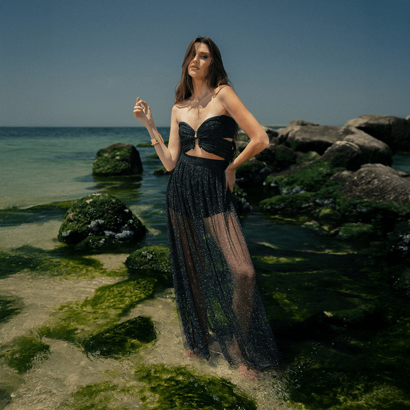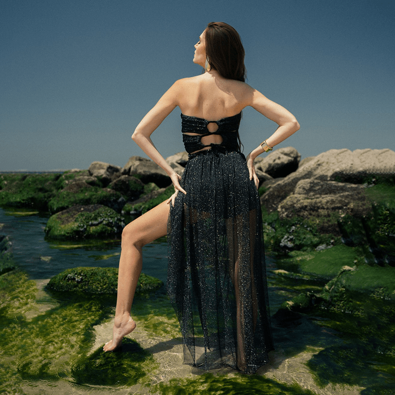 Glittery black and gold maxi sheer skirt in mesh, wide band high waist, ample and flowing style with slit on the side, black shorts underneath included.