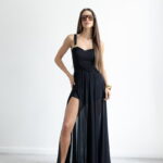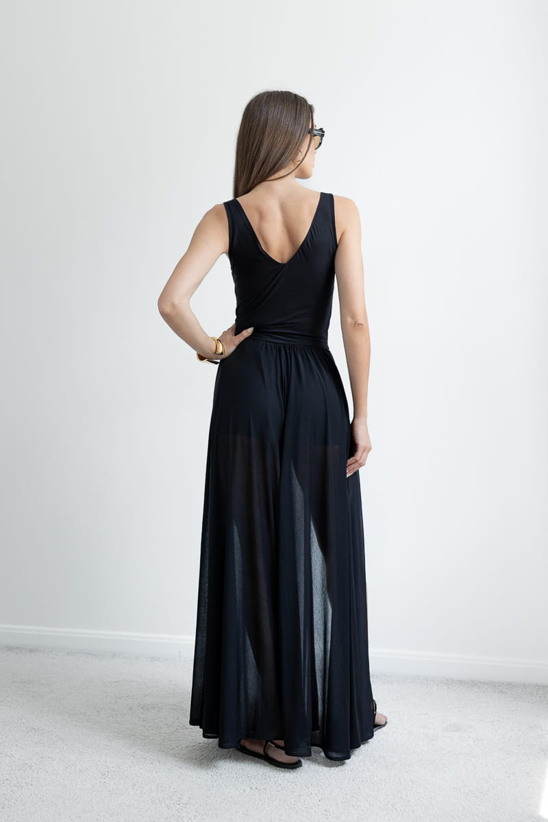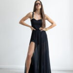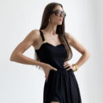 Black dress with heart neckline, wide straps with golden decorative metal details, marked elasticated waist, sheer flowing wide side slit skirt, black shorts underneath included.