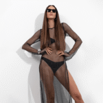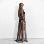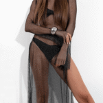 The Nyra Black Dress is allure woven in light, sheer, glittering, and unapologetically bold. Its flowing mesh fabric catches every glimmer, while the long bell sleeves and side slit create a play of mystery and motion. Elegant yet daring, it moves like moonlight over the sea.