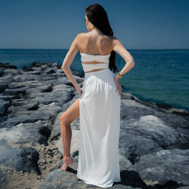 Strapless cut out maxi dress in pure white with wide bands joined in braided loops with golden metal details, open double banded cut out back, side slit skirt.