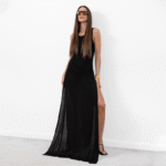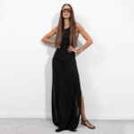 Black sleeveless beach maxi dress, open low cut out back, round neck & side slits flowing skirt, slightly sheer.