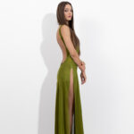 A sleeveless beach maxi dress with a flowing skirt, side slits, and an open low cut-out back. Light, soft, and subtly sheer, it offers an effortless, feminine feel, perfect for beach days or summer evenings.