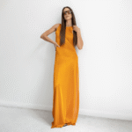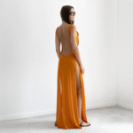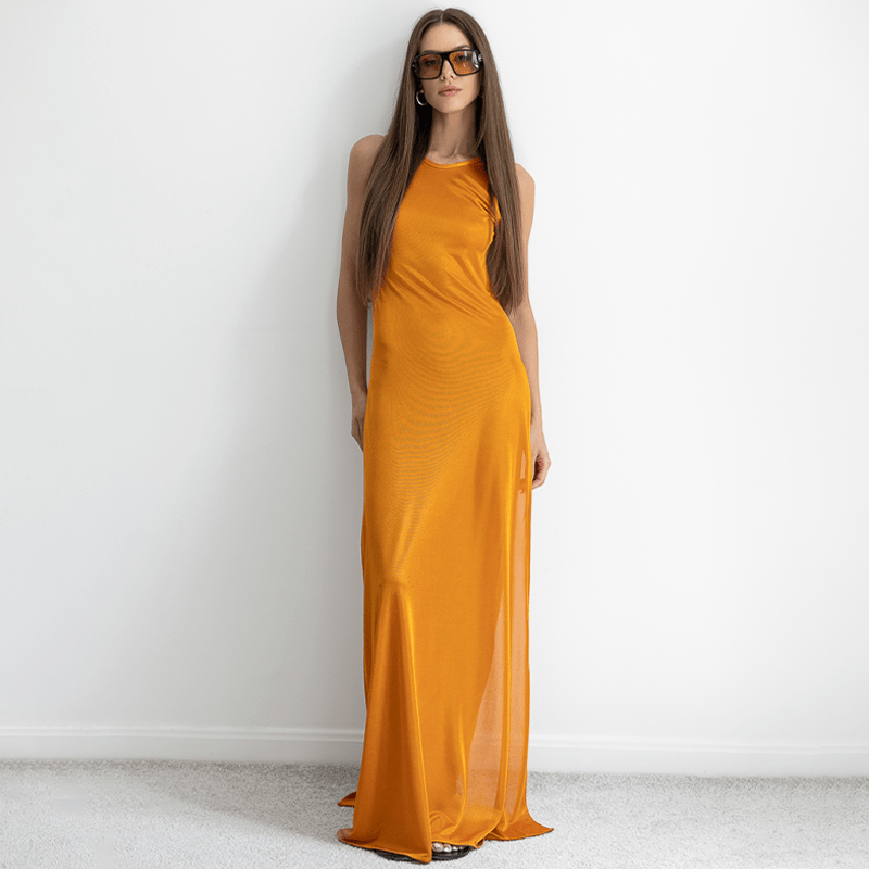 Sleeveless maxi beach dress in honey, open low cut out back, round neck & side slits flowing skirt, soft sheer & shine.