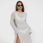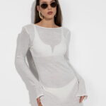 Sheer white beach dress, long straight sleeves, boat neck & side slits flowing skirt, open rounded back.